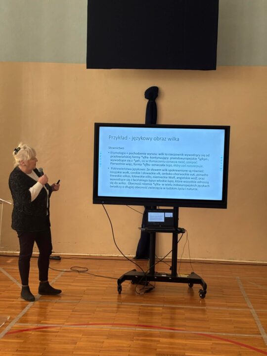 Fascynującym wątkiem wykładu było osadzenie wilka w nazwach własnych i topografii Polski. Pani profesor przytoczyła dane, według których około 400 tysięcy Polaków nosi nazwiska wywodzące się od tego zwierzęcia – od prostego Wilka, przez Wilczka i Wilczewskiego, aż po rzadsze formy jak Wilczura czy Wilkoń. Podobnie wygląda mapa naszych miejscowości: Wilkowyja, Wilcze Gardło czy nawet pobliskie Wilkowice to ślady dawnej obecności watah na naszych ziemiach. Co ciekawe, choć współcześnie dzięki ekologii i wiedzy o ochronie przyrody obraz wilka łagodnieje, stając się symbolem wolności, niezależności i surowego piękna, język wciąż przechowuje dawne lęki. Odnajdujemy je we frazeologii: „patrzeć wilkiem”, „wywołać wilka z lasu” czy w biblijnym ostrzeżeniu przed „wilkiem w owczej skórze”. Nawet w sporcie czy harcerstwie (słynne „Wilczki”) odwołujemy się do symboliki siły i wspólnoty stada, którą uosabiała już legendarna wilczyca kapitolińska karmiąca Romulusa i Remusa.