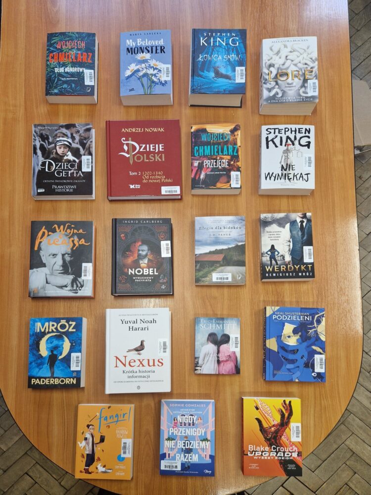 Księgozbiór wzbogacił się o 270 nowych egzemplarzy. Przy wyborze książek uwzględnione zostały propozycje nauczycieli i uczniów. Wśród zakupionych pozycji znalazły się przede wszystkim nowości wydawnicze: literatura obyczajowa, fantasy, kryminały oraz książki odnoszące się do historii Polski XX wieku, psychologiczne, biografie, reportaże i lektury szkolne.