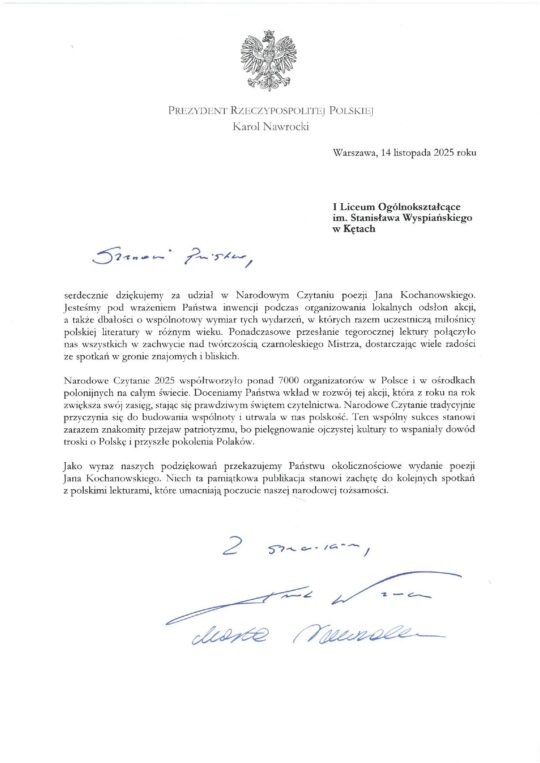 Prezydent RP Karol Nawrocki w dowód uznania przekazał naszej szkole okolicznościowe wydanie poezji Jana Kochanowskiego, zachęcając tym samym do kontynuowania pięknej tradycji czytania literatury narodowej.