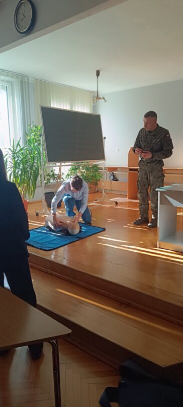 Druga część spotkania miała charakter szkoleniowy i została poprowadzona przez starszego kaprala. Przypomnieliśmy sobie zasady udzielania pierwszej pomocy, a poszczególne etapy działań ratowniczych zaprezentowali wybrani uczniowie. Starszy kapral na bieżąco korygował pojawiające się błędy podczas wykonywania RKO oraz zaprezentował prawidłowy sposób założenia stazy taktycznej.
