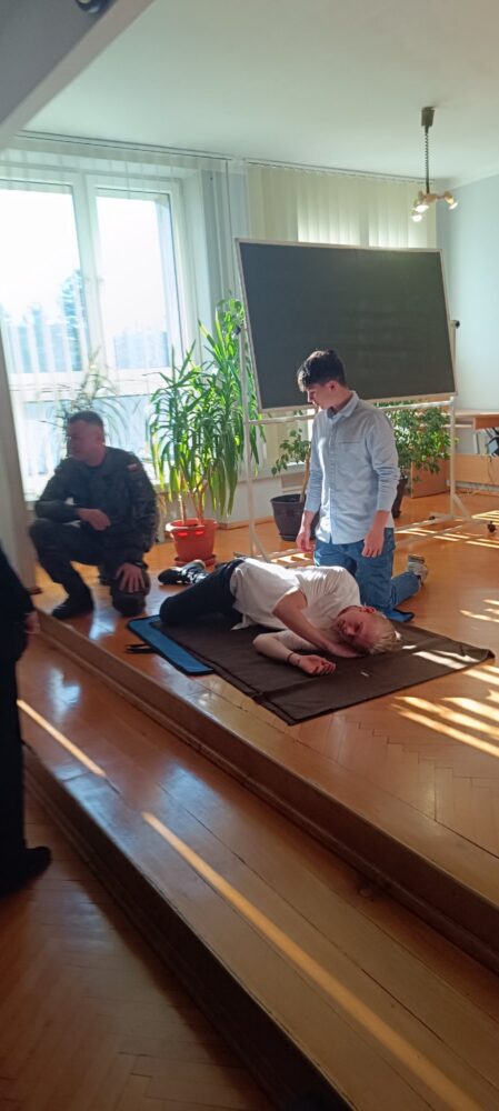 Druga część spotkania miała charakter szkoleniowy i została poprowadzona przez starszego kaprala. Przypomnieliśmy sobie zasady udzielania pierwszej pomocy, a poszczególne etapy działań ratowniczych zaprezentowali wybrani uczniowie. Starszy kapral na bieżąco korygował pojawiające się błędy podczas wykonywania RKO oraz zaprezentował prawidłowy sposób założenia stazy taktycznej.
