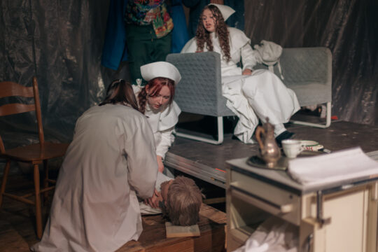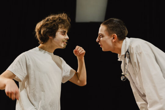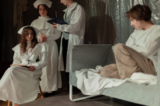 Niezwykłym zabiegiem była interakcja lekarzy z widownią na początku spektaklu. Zanim akcja skoncentrowała się na głównym bohaterze, personel medyczny wkroczył między rzędy, przeprowadzając improwizowane badania na widzach. Zadawanie pytań o stan zdrowia, sprawdzanie odruchów czy uważne notowanie spostrzeżeń na temat publiczności sprawiło, że granica między sceną a widownią uległa całkowitemu zatarciu. Widz przestał być bezpiecznym obserwatorem, a stał się potencjalnym pacjentem, co od razu narzuciło ton całej inscenizacji. W relacji z Walpurgiem lekarze wykazywali się skrajnym chłodem i mechanicznym podejściem. Ich obecność – z notesami i stetoskopami – nie niosła obietnicy powrotu do zdrowia, lecz była formą intelektualnej i fizycznej opresji.